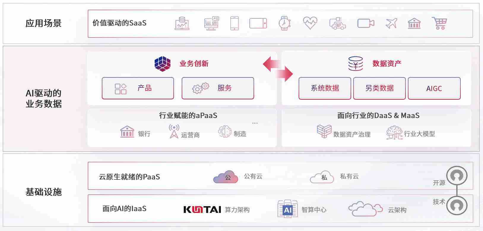 数字时代,,围绕企业数字化转型的关键要素,,尊龙z6数码开创性的提出数云融合战略和技术体系框架,,,,着力在云原生、、、数字原生、、、AI原生和信创产业上架构产品和服务能力,,,,为处在不同数字化转型阶段的快消零售、、汽车、、、、金融、、、、医疗、、、政企、、、教育、、运营商等行业客户提供泛在的敏捷IT能力和融合的数据驱动能力,,构建跨界融合创新的数字业务场景和新业务模式,,,助力企业级客户建立面向未来的核心能力和竞争优势,,全面推动社会的数字化、、、智能化转型升级。。。。