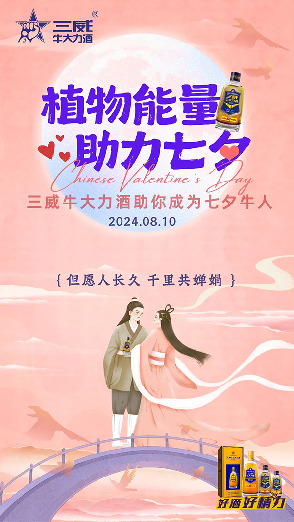 爱在七夕,,,,情满人间,,,,心心相吸,,都渴今夜望璀璨的相遇。。。今夕何夕,,,,当繁星点缀夜空,,三威牛大力酒携植物之精粹,,为你的七夕之夜添上一份不凡的活力与浪漫!!!星光熠熠七夕夜,,,不仅是爱情的甜蜜绽放,,更是展现个人魅力的绝佳时机!!! 你是否渴望在繁星下,,成为她眼中那个特别的“牛人”??