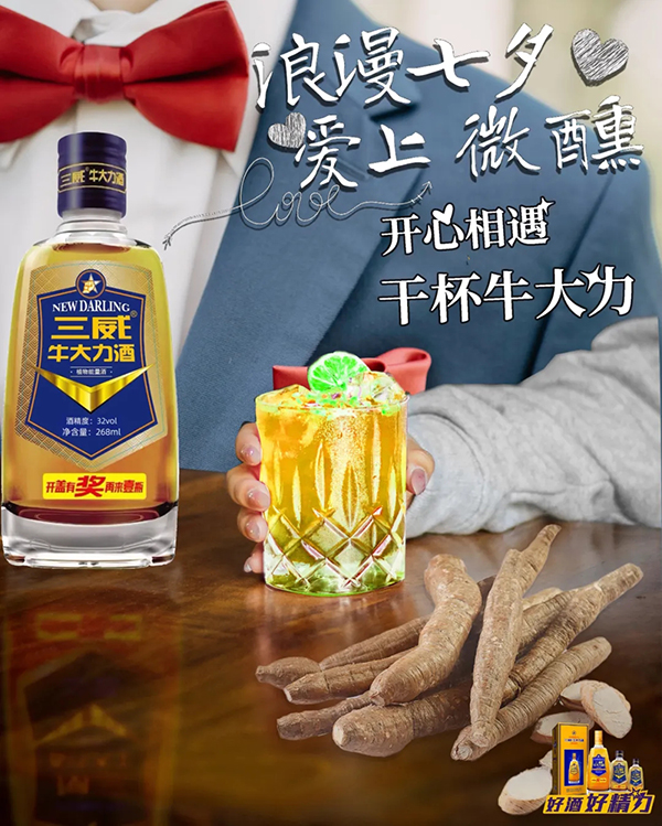 【好酒精力,,,七夕牛人非你莫属】 无论是与爱人共赴浪漫晚餐,,,还是星空下的深情告白,,三威牛大力酒都是你的秘密武器。。。。它不仅仅是一杯酒,,,更是你自信与魅力的源泉。。一饮而下,,,,瞬间精力充沛,,,思维敏捷,,,让你在七夕之夜,,,,成为最耀眼的牛人,,,,俘获她的芳心。。。。